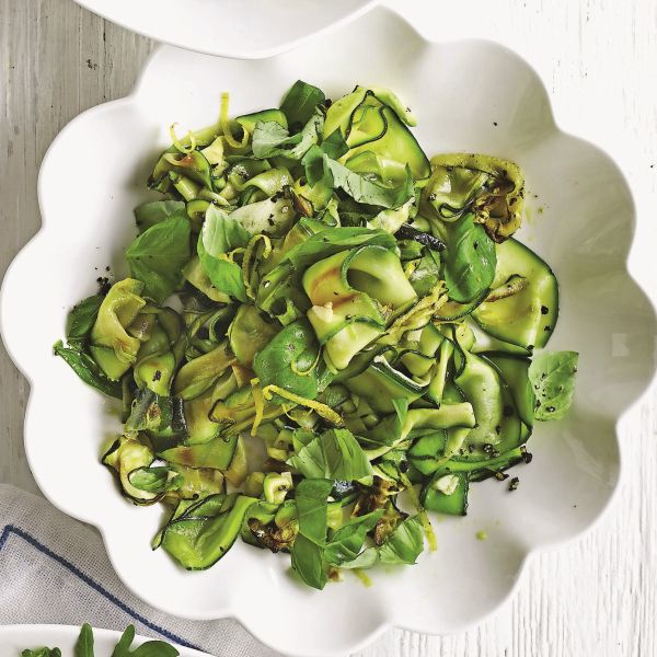 Z lupilnikom za zelenjavo narežemo bučki na široke trakove, sredico s semeni pa zavržemo. Olje segrejemo v ponvi, dodamo limonovo lupinico in strt česen ter na srednji temperaturi pražimo eno minuto. Dodamo bučkine trakove in dušimo še kakšno minuto ali dve, da se bučke rahlo zmehčajo. Stalno jih mešamo. Nato jih poškropimo z limonovim sokom in vmešamo nastrgane liste bazilike.