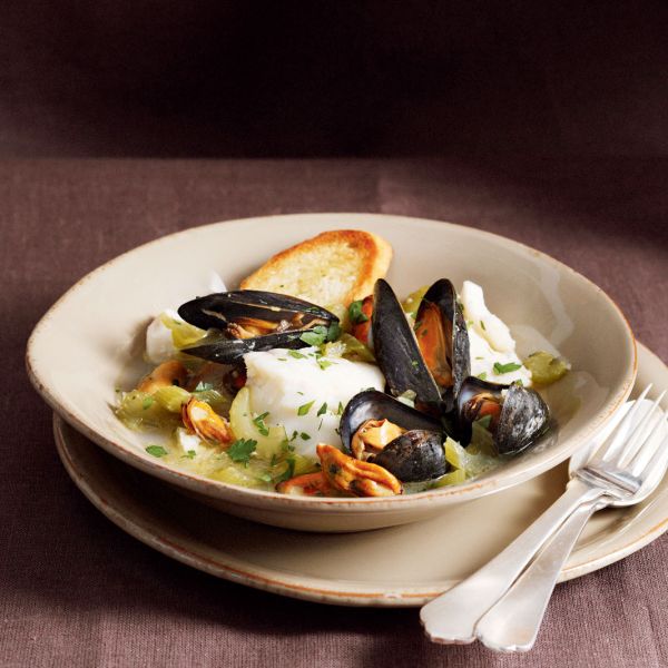 File trske položimo v posodo z vodo od kuhanja školjk, ga obilno popramo in pri zmerni temperaturi pokritega kuhamo približno 20 minut oziroma tako dolgo, da se file skuha, a ostane čvrst. Nato v posodo stresemo meso klapavic, preostale klapavice v lupini in tekočino, če je ostala v skledi, pokrijemo in kuhamo še 2 minuti, da se vse dobro segreje.