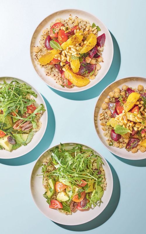 Zgornji grelnik v pečici segrejemo na najvišjo stopnjo. Ribja fileja damo v plitvo ognjevarno posodo in ju pečemo 8 do 10 minut, odvisno od njune debeline. Kvinojo zmešamo s kumaro, paradižnikom, čebulo, limonovim sokom in preostalimi zelišči. Solato razdelimo na krožnika in dodamo ribo. Zeliščni jogurt z žlico polijemo po ribi ali pa ga postrežemo posebej.