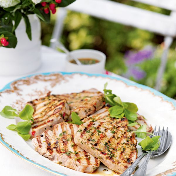 Tunine steake premažemo s chermoulo in jih pustimo počivati 15 minut. Na naoljeni rešetki žara ali v močno razgreti naoljeni rebrasti ponvi jih pečemo 1 minuto na vsaki strani, nato jih pustimo 3 minute počivati. Postrežemo jih s preostalo chermoulo.