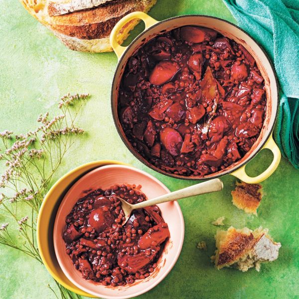 Kozico prestavimo v pečico za 55 minut do 1 uro, da se leča skuha, zelenjava pa se zmehča, a je še malce čvrsta na ugriz. Tekočina se bo medtem zgostila in povrela. Peso po burgundsko naložimo v skledice in jo po želji postrežemo s kruhom.