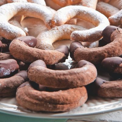 Ko testo skoraj podvoji volumen, pripravimo nadev. Dva beljaka stepemo s sladkorjem v trd sneg. Marcipan narežemo na drobne koščke in jih pomešamo s cimetom in mandlji ter vmešamo v sneg. Pekač premažemo z oljem in pomokamo.