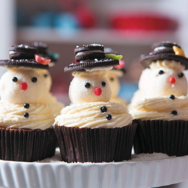 Za kremo penasto zmešamo maskarpone, sladko smetano in sladkor. Za glavice zmešamo kokosovo moko, sladkor in kislo smetano in iz mase oblikujemo 12 kroglic. Na ohlajene mafine nabrizgamo kremo in nanjo posadimo glavice. Vsako okrasimo s čokoladnimi bombončki za oči in gumbke ter z rdečim bombončkom za nosek. Nazadnje snežakom na glave poveznemo še pol velikega in en mali piškot, ki ju zlepimo s kremo.