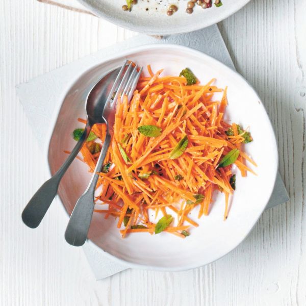 Korenje naribamo in ga damo v skledo skupaj z metinimi listki. Zabelimo ga s prelivom, solimo, popramo in dobro premešamo.