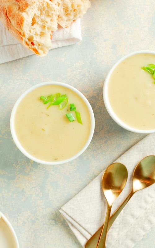 Primešamo sesekljan česen, pražimo še 1 minuto, nato dodamo olupljena in na koščke narezana zeleno in krompir. Dobro zmešamo ter začinimo s soljo in belim poprom. Prilijemo jušno osnovo, zavremo, nato nežno kuhamo približno 30 minut, da se zelenjava popolnoma zmehča.