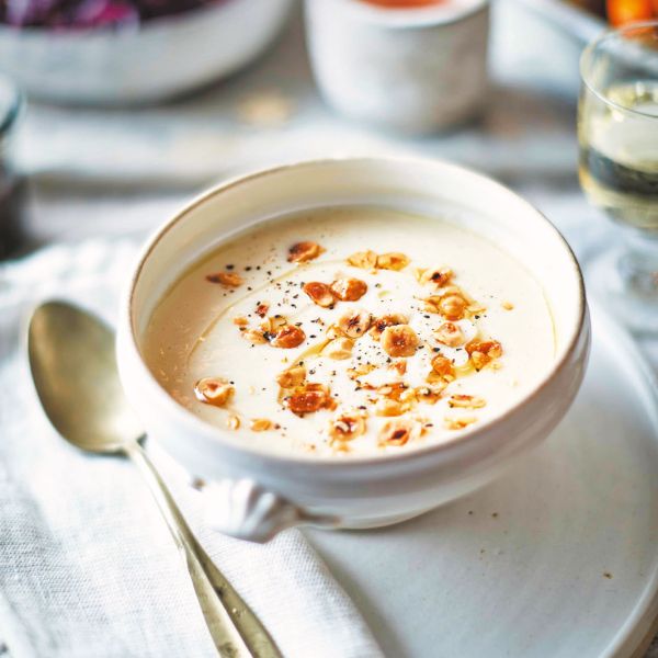 Preden juho postrežemo, jo dobro pogrejemo in razdelimo v skledice. Posujemo z grobo nasekljanimi lešniki, čez nameljemo črni poper in pokapamo s še malo tartufovega olja.