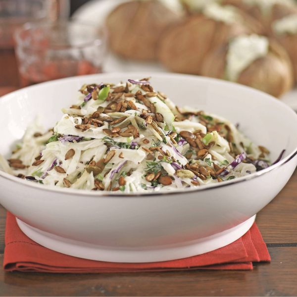 Jabolku odstranimo peščišče, ga narežemo na tanke rezine in zmešamo s preostalim limonovim sokom. Majonezo stepemo z oljem, kisom in gorčico ter po okusu solimo in popramo. V solatni skledi zmešamo vso zelenjavo z jabolkom, nasekljanim peteršiljem in nasekljano mlado čebulico, nato vmešamo preliv. Solato razdelimo v skodelice in jo potresemo s semeni in oreški.