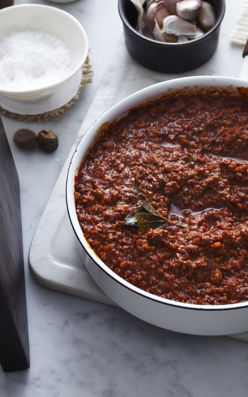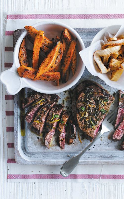 Zrezki v omaki čimičuri s sladkim krompirjem in čebulnimi obročki