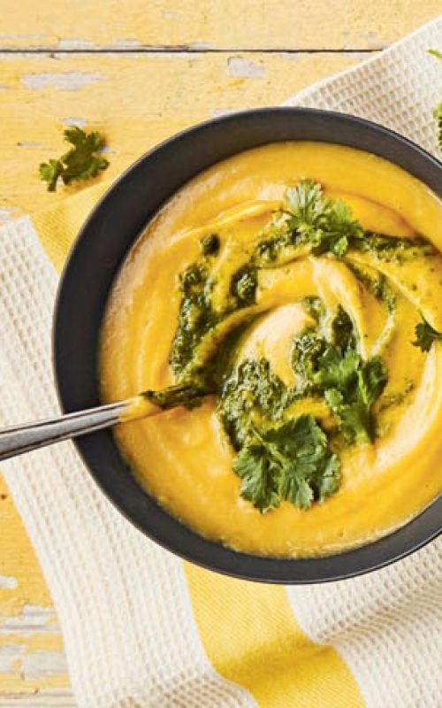 Juha iz sladkega krompirja, kokosovega mleka in limonske trave s koriandrovo salso