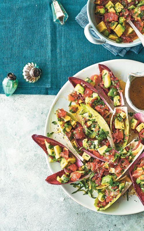 Radičevi čolnički s salso iz avokada in rožnate grenivke
