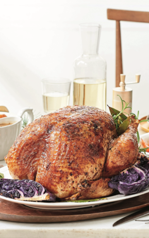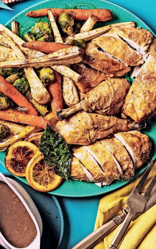 Hitro pečen praznični piščanec z lepljivo zelenjavo