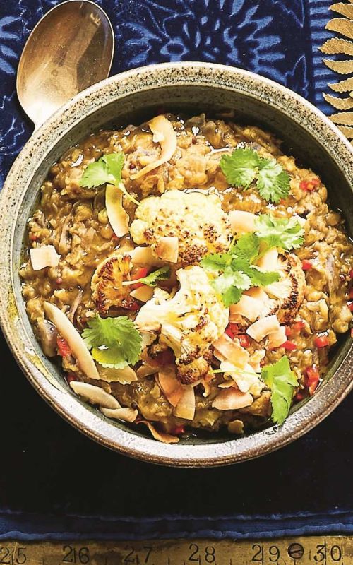 Lečni dal z rdečim zeljem, cvetačo in kokosom