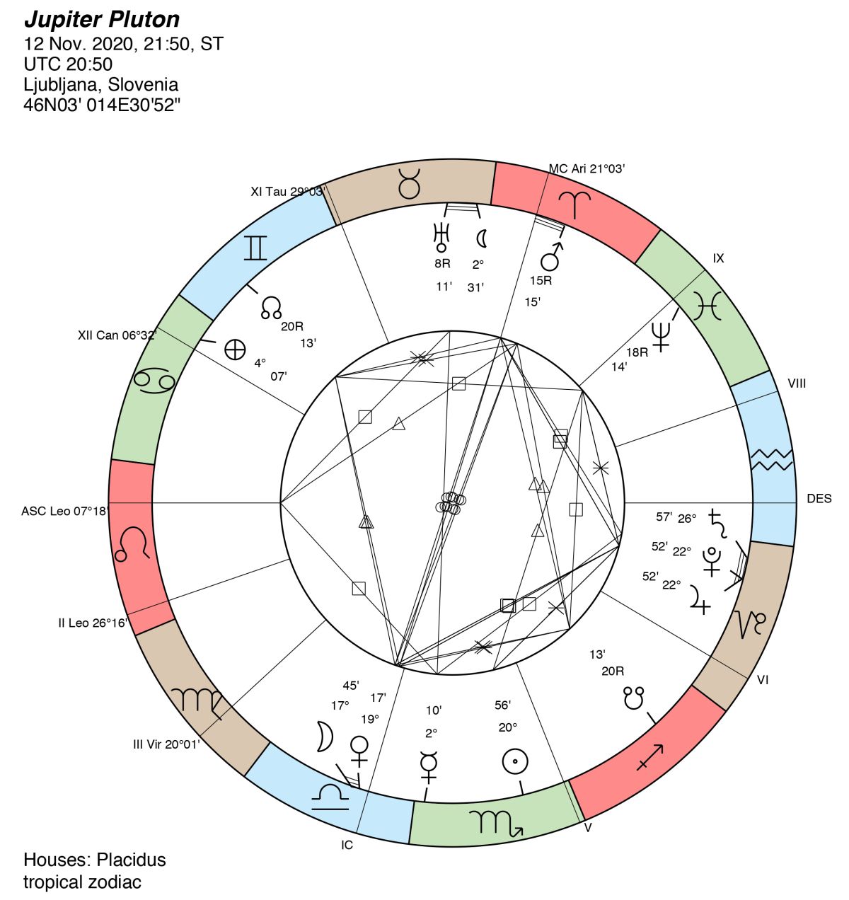 Prvo srečanje Jupiter-Pluton je bilo 4. aprila, drugo 30. junija, in ker se je medtem Jupiter retrogradno obračal, je zdaj, 12. novembra, njuno zadnje srečanje. Pred prvim srečanjem je otvoritve globljih sprememb na svetovni ravni aktiviralo srečanje Saturna in Plutona, 12. januarja. To je sprožilo spreminjanje karmičnih plasti človeštva, saj oba planeta simbolizirata prav to. Srečala sta se Saturn, vladar sistemov, Zemlje in reda, ter Pluton, vladar podzemnih, nevidnih, a močno transformirajočih energij, in zakuhala kaotično leto 2020, ko se očitno vse spreminja, ruši, obnavljajo pa se prave, smiselne vrednote pri posamezniku.