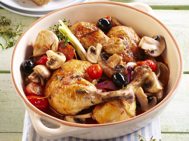 Odstranite pokrov in mesu dodajte prepolovljene paradižnike, čebulo, gobe in olive. Vse skupaj pecite še 15 minut. Postrezite z belim kruhom.