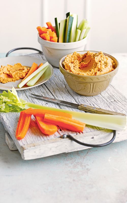 Humus s pečeno papriko in orehi ter svežo zelenjavo