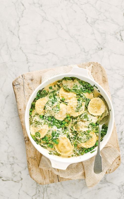 Zapečeni ravioli s špinačo in kremastim limonovim prelivom