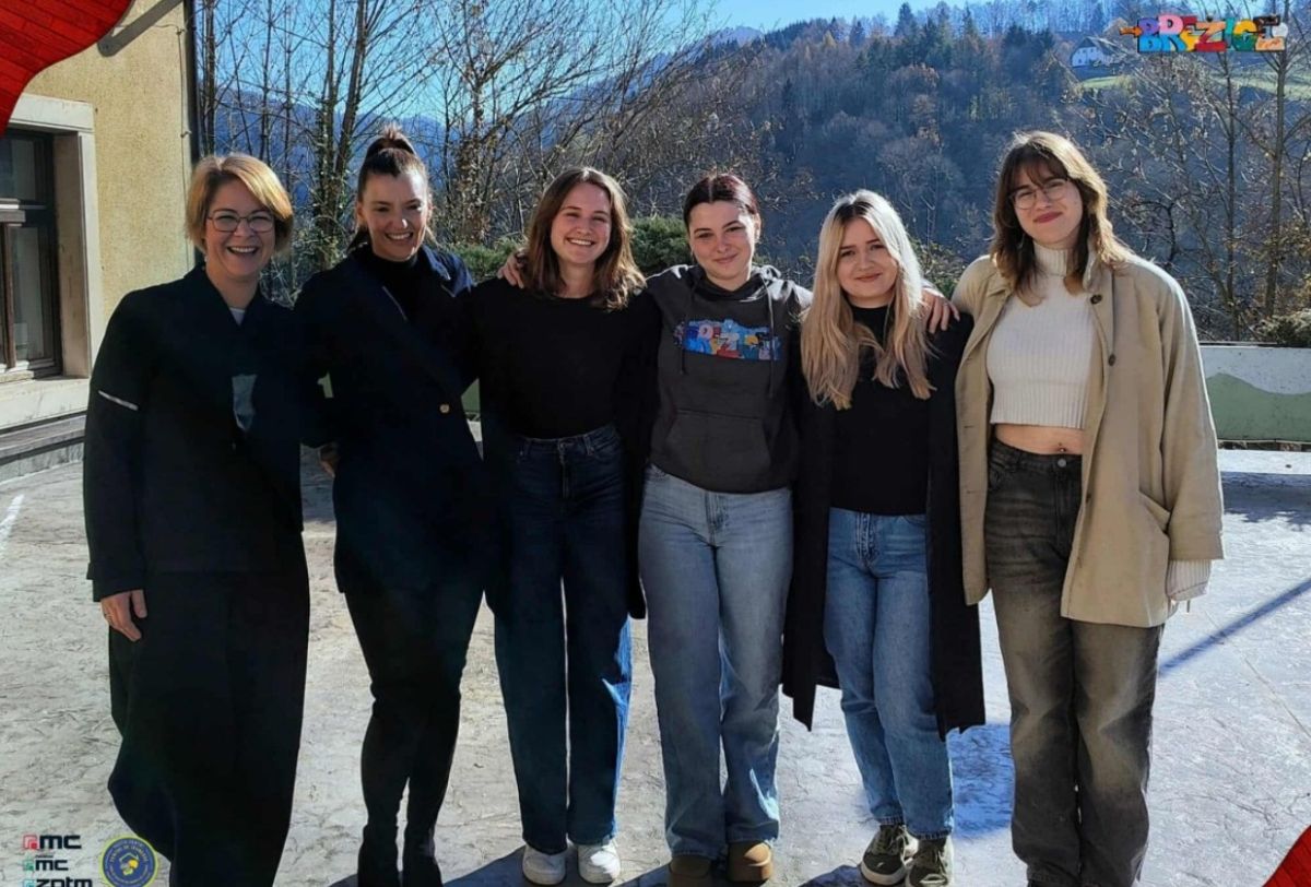 Obisk je bil za obe ekipi odlična motivacija in priložnost, da so dobre prakse iz nekega okolja lahko navdihujoče tudi za drugo okolje. Na fotografiji (od leve proti desni) so vodja MC Idrija Jerca Korče, Maja Nikolić iz MC Brežice, Nives Istenič iz MC Idrija, praktikantka v MC Brežice Zana Kostić ter Hava Hodžić in praktikantka Ema Vasiljevič iz MC Brežice.