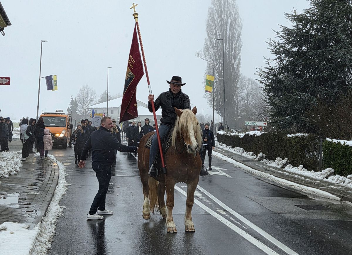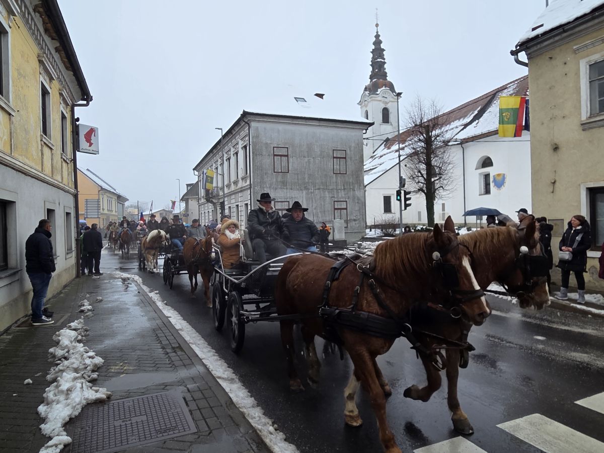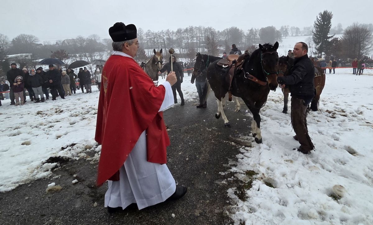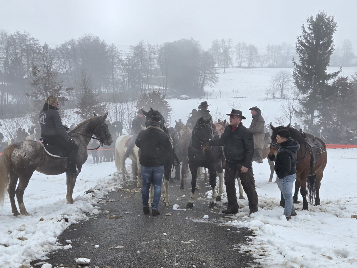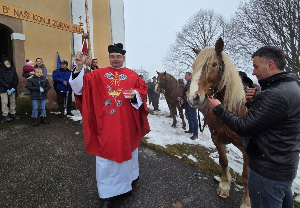 Kljub dežju in snežinkam okrog sto konj po blagoslov v Dolenjo Staro vas