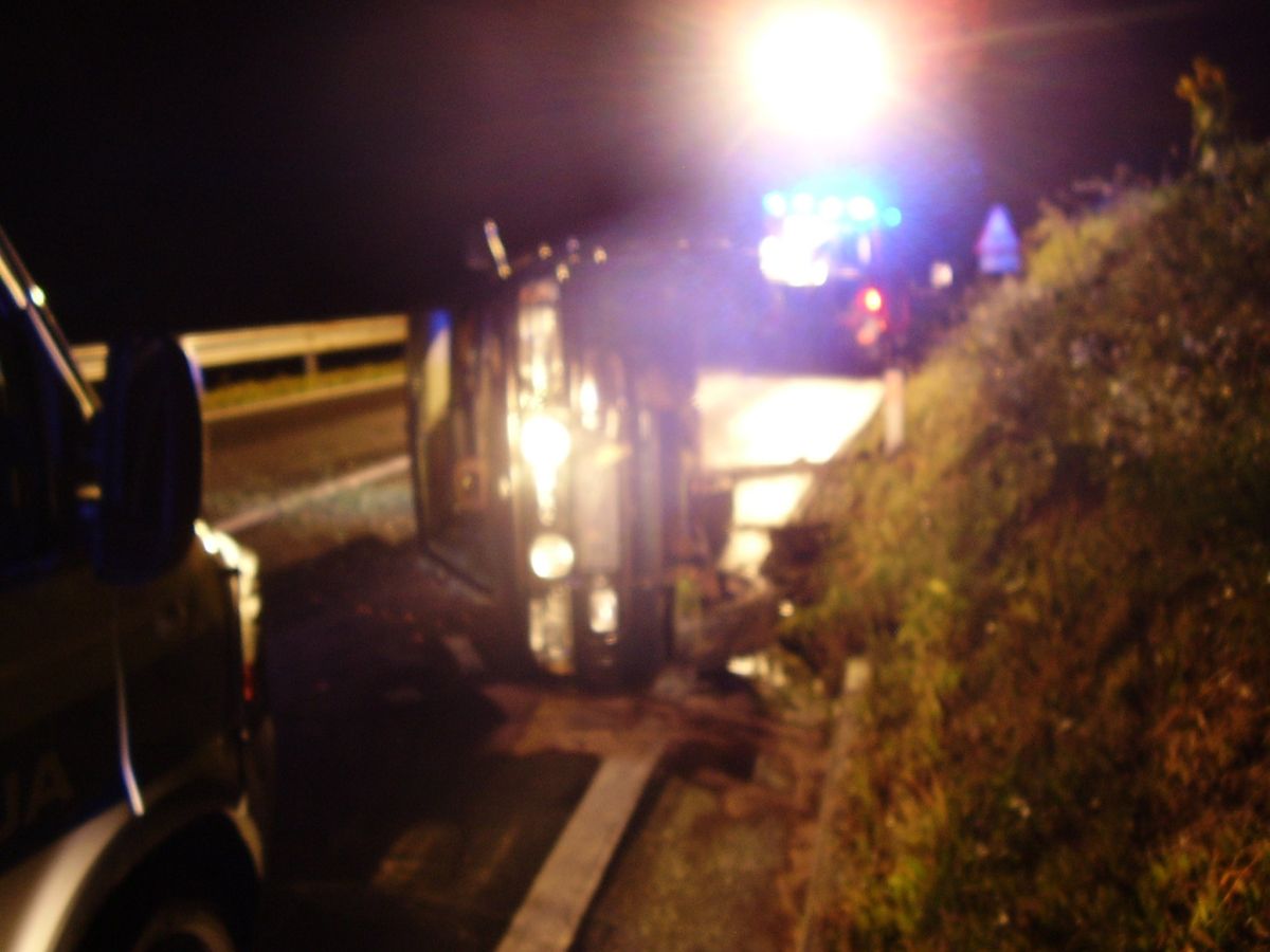 Davi kako uro popolnoči so bili novomeški policisti obveščeni o prometni nesreči v Gornji Težki Vodi. Lažje poškodovanega voznika in sopotnika so reševalci z vozilom nujne medicinske pomoči odpeljali v novomeško bolnišnico. Policisti so opravili ogled prometne nesreče, zbrali obvestila in ugotovili, da je voznik zaradi neprilagojene hitrosti izgubil nadzor nad vozilom in se z vozilom prevrnil.