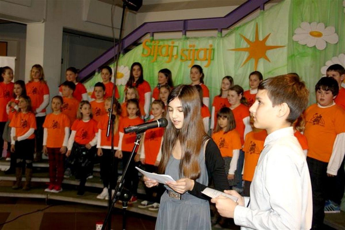 Brežiška območna izpostava javnega sklada za kulturne dejavnosti je v sodelovanju z osnovno šolo Dobova organizirala včeraj v avli Ekonomske in trgovske šole Brežice območno revijo otroških pevskih zborov z naslovom Sijaj, sijaj, sončece.