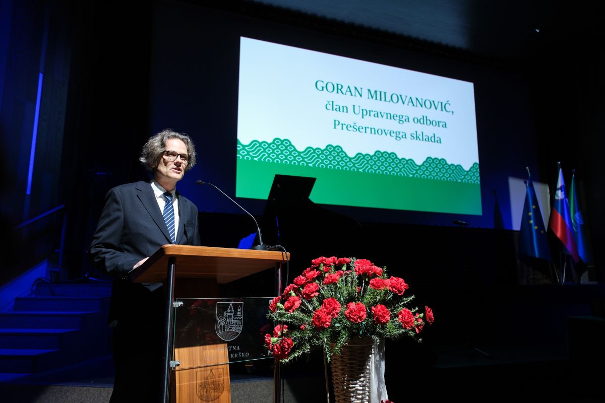 Slavnostni govornik je bil član Upravnega odbora Prešernovega sklada in direktor Galerije Božidar Jakac Goran Milovanović, ki je poudaril, da kultura ni nekaj samoumevnega ali zaključenega, temveč živ prostor, ki nastaja iz ustvarjalnosti, predanosti in skupnosti. Posebej je izpostavil pomen ljubiteljske kulture, ki temelji na prostovoljnosti, osebni motivaciji in povezanosti ljudi, ter poudaril, da ta ni manjvredna profesionalni kulturi, temveč z njo tvori neločljivo celoto – srce in razum kulturnega prostora.