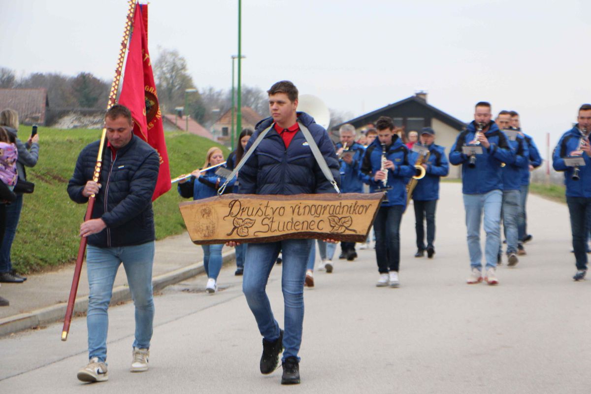 Na čelu je bil prapor Društva vinogradnikov Studenec, za njim Godba Sevnica, aktiv kmečkih žena Studenec, kočija z aktualnim kraljem cvička Andrejem Grabnarjem in vprega s posodami za prevoz vina in grozdja.
