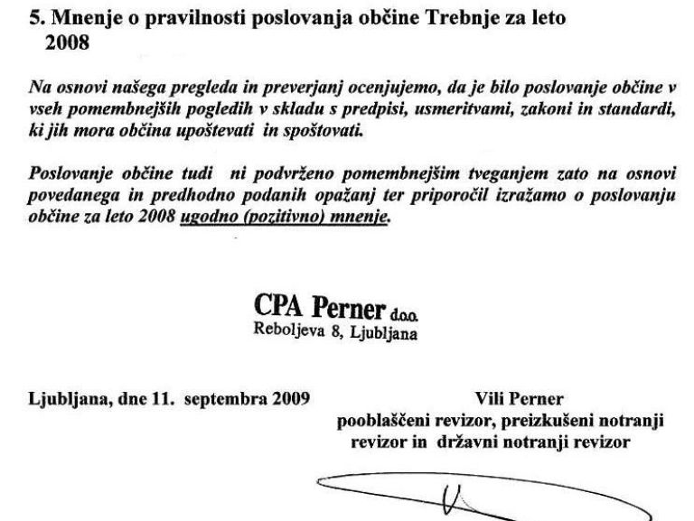 Zaključni račun je pregledal preizkušeni, pooblaščeni, državni notranji revizor. Ta revizor je v pisnem sklepnem mnenju zapisal, da je bilo poslovanje Občine Trebnje v letu 2008 v vseh pomembnejših pogledih v skladu s predpisi, usmeritvami, zakoni in standardi. Zato je Občini Trebnje izdal uradno, ugodno pozitivno mnenje! Nadzorni odbor Občine Trebnje je tudi pregledal Zaključni račun za leto 2008 v okviru svojih pooblastil. Tudi Nadzorni odbor ni našel nobenih napak v zaključnem računu, dal pa je nekaj priporočil za v prihodnje. Podžupan Občine Trebnje Jože Povšič se je v četrtek 03.12.2009 na Občini Trebnje še enkrat uradno sestal s predsednico Nadzornega odbora Občine Trebnje Darinko Krevs in jo ponovno vprašal, če je Nadzorni odbor v Zaključnem računu za leto 2008 našel kaj napak ali nepravilnosti. Predsednica je potrdila, da napak in nepravilnosti ni bilo in da potrjuje tako Poročilo Nadzornega odbora, ki je bilo Občini Trebnje izdano, in se hkrati strinja s pooblaščenim državnim notranjim revizorjem. Realizacija proračuna Občine Trebnje za leto 2008 je bila na prihodkovni in odhodkovni strani podobna kot v zadnjih osmih letih.