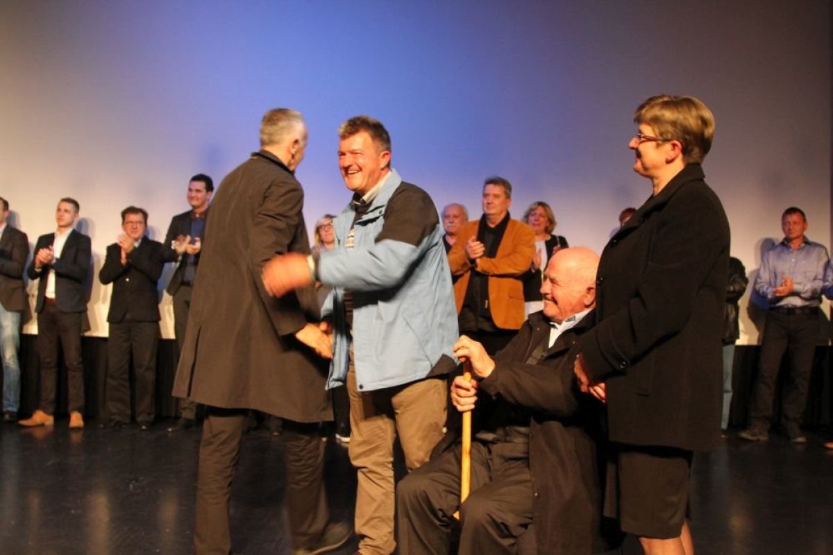 Občinstvo v že nekaj dni pred premiero razprodani dvorani je s stoječimi ovacijami pozdravilo ustvarjalce filma Sramota in žrtve montiranega procesa s sredine sedemdesetih let - Martina Uhernika in njegova že zdavnaj odrasla otroka Martina in njegovo sestro Marinko.