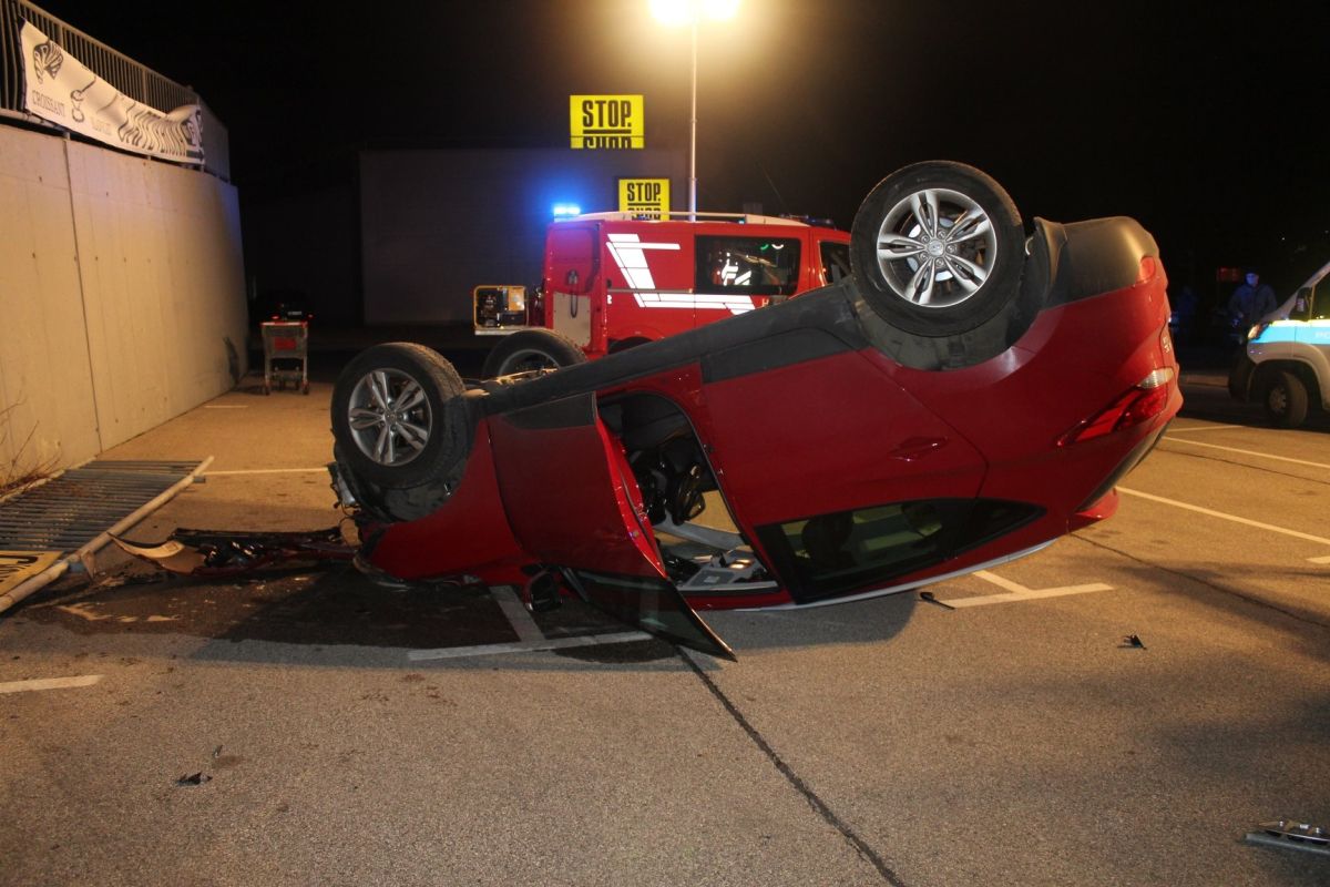 En avto prebil ograjo in pristal na parkirnem prostoru, drug na robu betonskega zidu