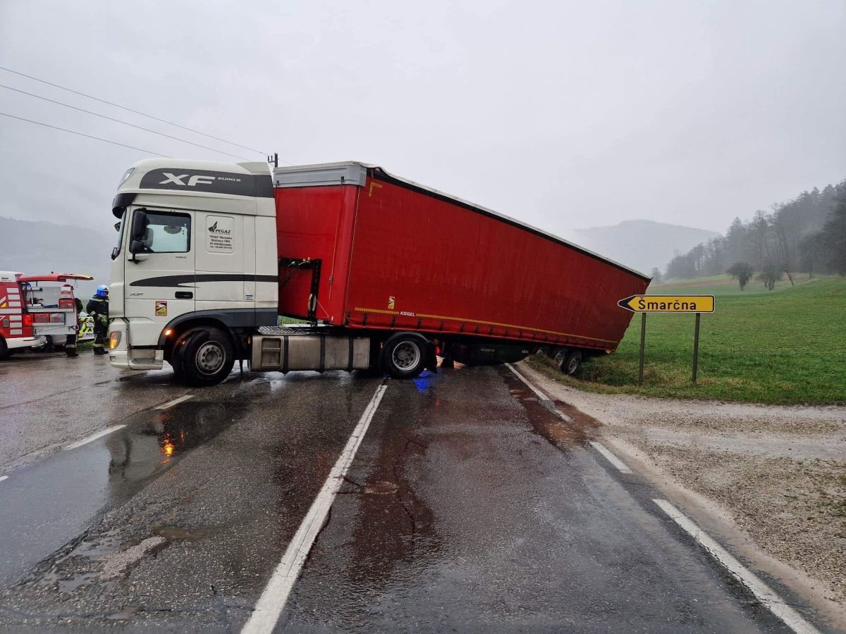 FOTO: Prikolica tovornjaka zdrsnila v jarek