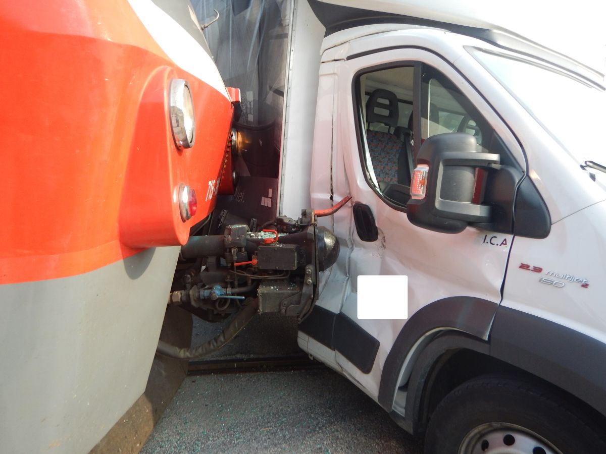 Trebanjski policisti so bili včeraj dopoldne okoli 8.30 obveščeni o prometni nesreči na Mirni. Ugotovili so, da je do trčenja vlaka in tovornega vozila prišlo, ko je 33-letni voznik tovornega vozila zapeljal na prehod ceste čez železniško progo v trenutku, ko je iz trebanjske smeri pripeljal vlak. Na potniškem vlaku je bilo pet potnikov in v nesreči ni bil nihče poškodovan. Policisti bodo 33-letnemu vozniku tovornega vozila izdali plačilni nalog zaradi kršitve cestno prometnih predpisov.