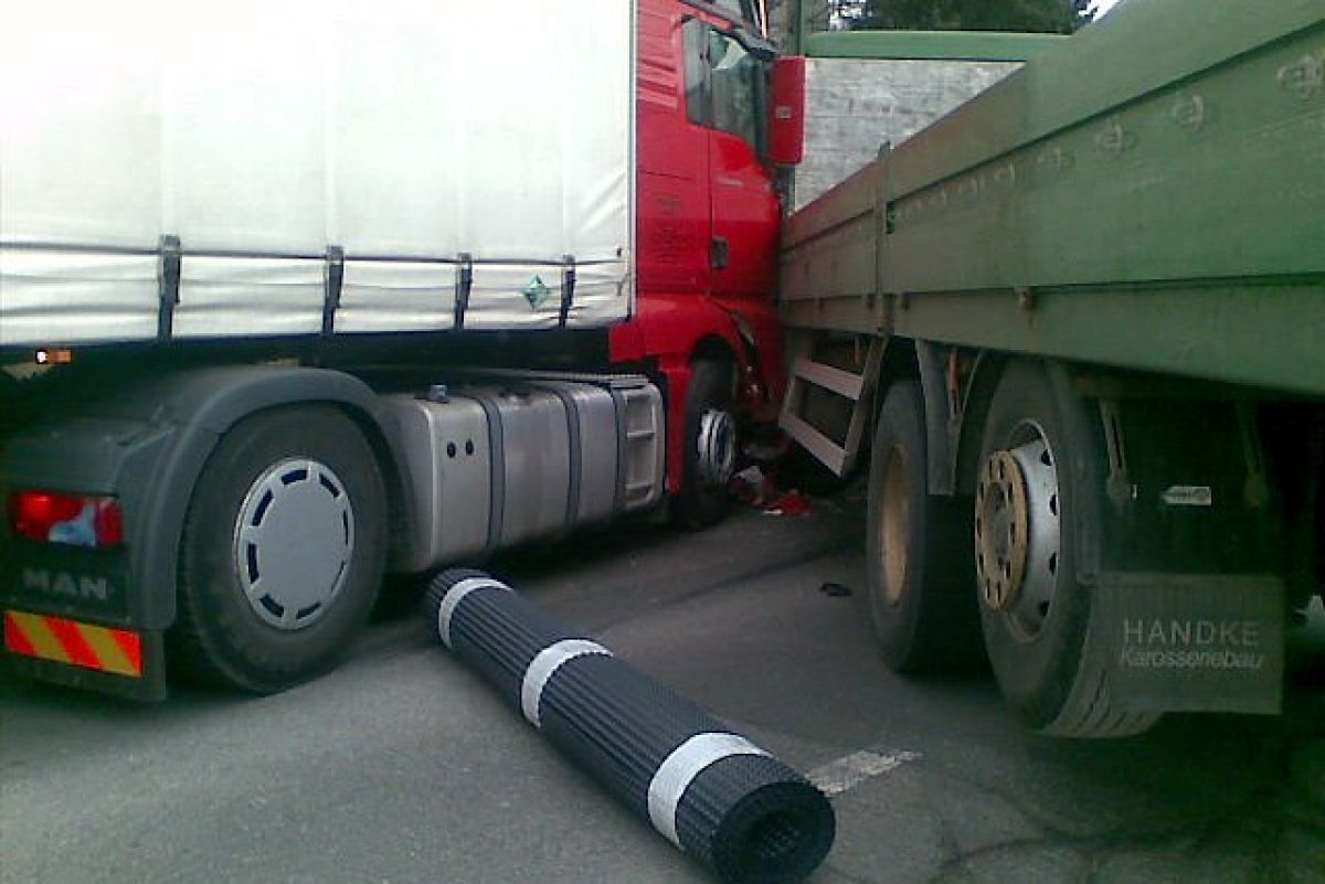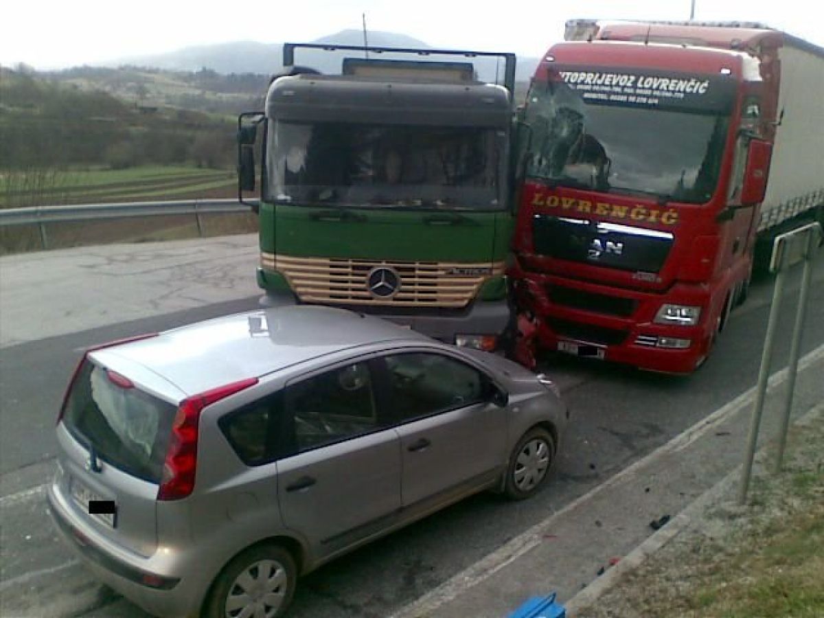 Po trku tovornih vozil je vozilo povzročitelja odbilo še v osebno vozilo, ki je stalo na vozišču.