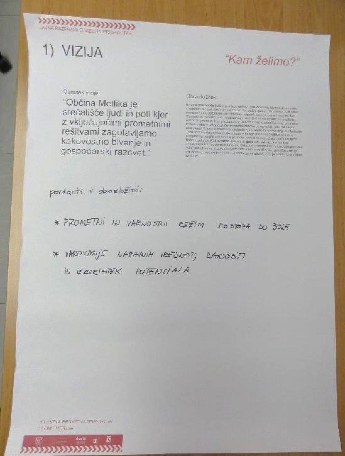 Javne razprave se je udeležilo 9 občanov iz različnih sredin. Delo je potekalo v dveh skupinah, s čimer je bila zagotovljena ustrezna informiranost in vključenost vseh prisotnih. Skupna končna mnenja so se tako oblikovala v okviru enakovredne razprave. Potrjena je bila vizija: »Občina Metlika je srečališče ljudi in poti, kjer z vključujočimi prometnimi rešitvami zagotavljamo kakovostno bivanje in gospodarski razcvet.« Obrazložitev vizije je bila dopolnjena z nekaj novimi vsebinami in je sledeča: beseda srečališče ljudi in poti lepo opišejo prostor sožitja bivanja in prometa, v katerem vse poti, tako cestne kot ostale, služijo ljudem. To obsega tudi dobro navezavo med občinskimi in državnimi cestami, povezavo med ostalimi deli Slovenije in Hrvaško (tudi tretjo razvojno os), varne šolske poti, živo mestno jedro ter pozitiven odnos do prometa, ki je predpogoj za aktivno in srčno sooblikovanje prometne kulture v občini. Vključujoče prometne rešitve se nanašajo tako na način oblikovanja Celostne prometne strategije kot izvedbo in spoštovanje te strategije – vse to z visoko samopobudo in udeleženostjo občanov. Rešitve so edina protiutež za pereče probleme v prometu, prav tako dopuščajo multifunkcijsko širino rezultatov. Kakovostno bivanje in gospodarski razcvet sta bila prepoznana kot zaželena izida dobre Celostne prometne strategije, obenem med kakovostjo bivanja in gospodarskim razcvetom v določenih ozirih (čisto okolje, mir, zdravje, varovanje narave in kulturnih vrednot) obstajajo nasprotja, zato je pomembno skrbeti za oboje.