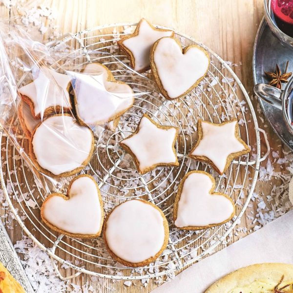 3. Pečico segrejemo na 180 °C (ali na 160 °C z ventilacijo). Testo na rahlo pomokani delovni površini razvaljamo na debelino 1 cm, nato iz njega z modelčki v obliki srca, zvezde ali kroga izrežemo 5 cm velike piškote. Prenesemo jih na dva plitva pekača, obložena s papirjem za peko, tako da je med njimi malo prostora, in jih pečemo 12 do 15 minut ali toliko časa, da se zlato obarvajo in malo narastejo. Preložimo jih na kuhinjsko mrežico in pustimo, da se popolnoma ohladijo.