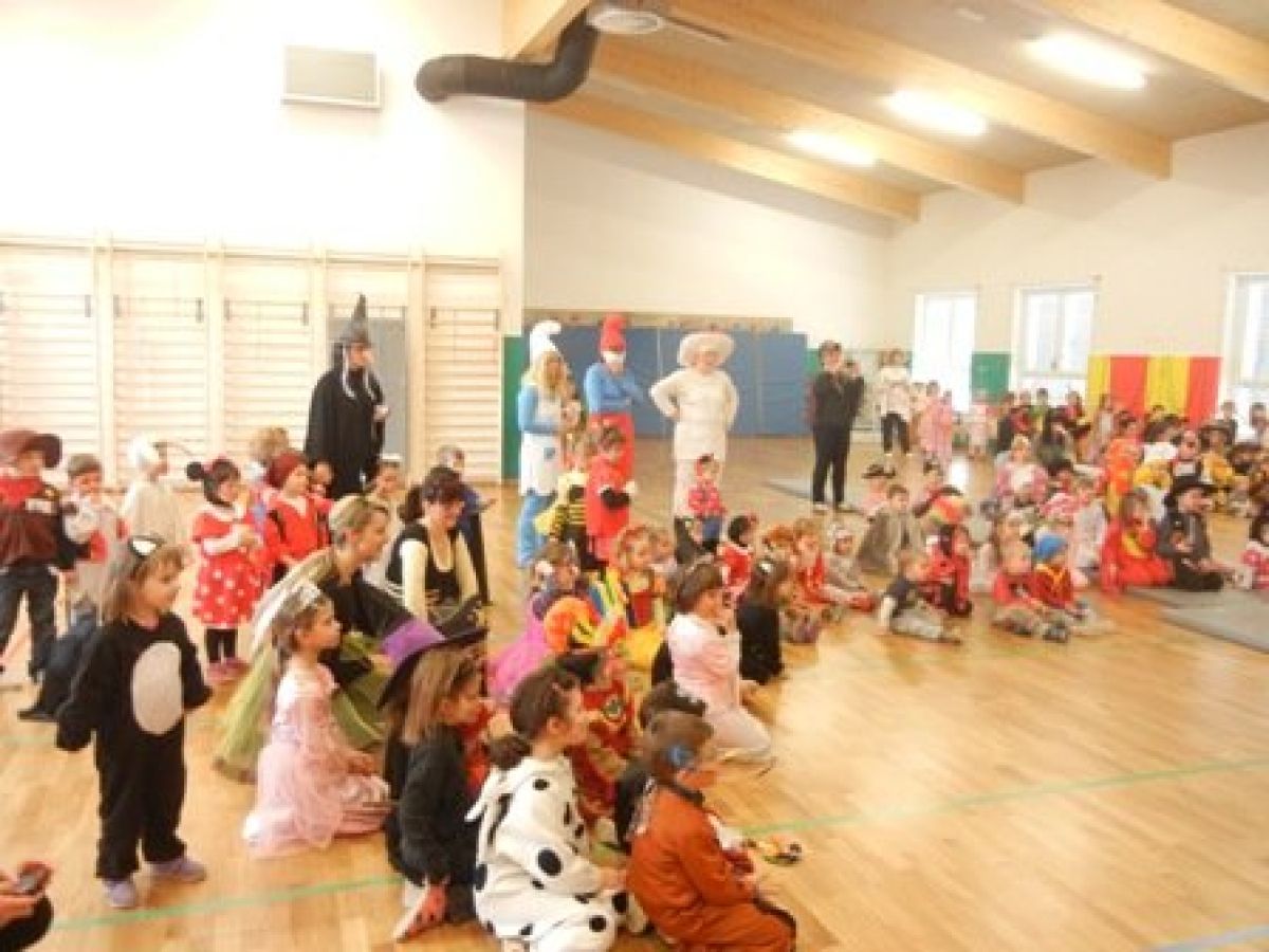 Tudi pustni torek ni minil brez pustne zabave. Še sreča, da imamo tako veliko telovadnico, saj so se zbrali prav vsi - od tistih najmlajših pa do najstarejših otrok. Priletele so tudi klepetave čarovnice, ki so čarale in spretno vodile pustno revijo. Maškare so bile živahne, vesele in glasne, tako kot se zanje spodobi in je prav. Glasba je vabila maškare k plesu in pustnemu rajanju. Vsi pa vemo, da brez naših kuharic ne bi bilo pravega pusta. Medtem, ko smo vsi veseljačili, so bile ravno one tiste, ki so napekle polne pladnje pustnih krofov.