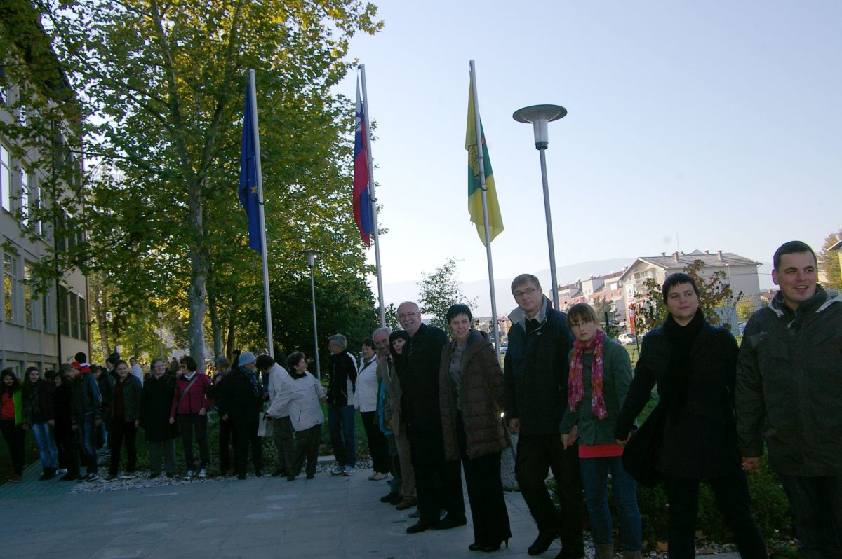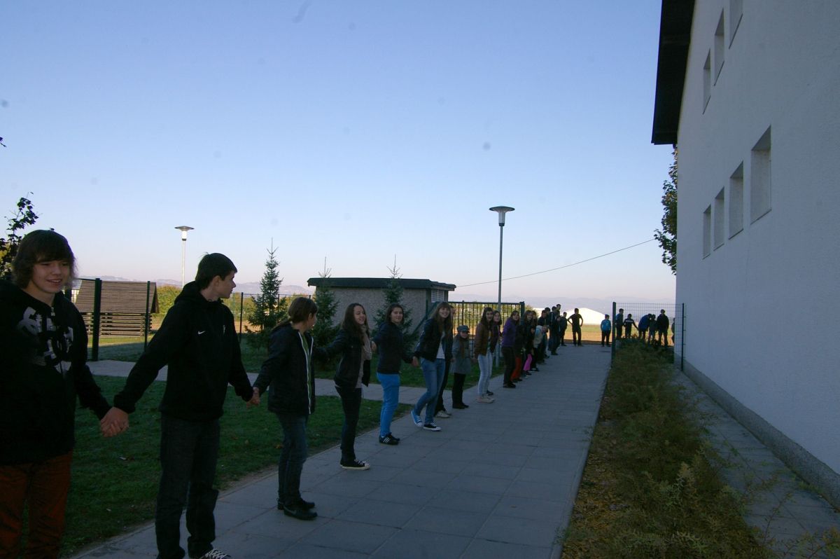 Ta teden, od 19. do 23. oktobra, OŠ Šentjernej gosti prijatelje iz Poljske. Na Dolenjskem se mudi 23 dijakov gimnazije iz Myslenic z ravnateljem in dvema učiteljicama. Čaka jih zanimiv teden, s pestrim programom, ogledi Dolenjske in Slovenije, med zanimivejšimi dogodki pa je bil tudi današnji, t.i. objem šole. Kot pravi organizatorka dogodka Alenka Bašelj, je šola prostor, ki vse povezuje in v kateri so se in se še bodo stkala mnoga dolgoletna prijateljstva, zato so jo skupaj s poljskimi prijatelji na simboličen način tudi objeli. V verigi, ki je bila dolga kar 350 metrov, so sodelovali vodstvo šole z ravnateljico Viktorijo Rangus, delavci občinske uprave z županom Francem Hudoklinom na čelu, pa tudi upokojeni delavci šole. Zbrani – preko šesto ljudi – se je prijelo in sklenilo verigo okrog šolskega poslopja.