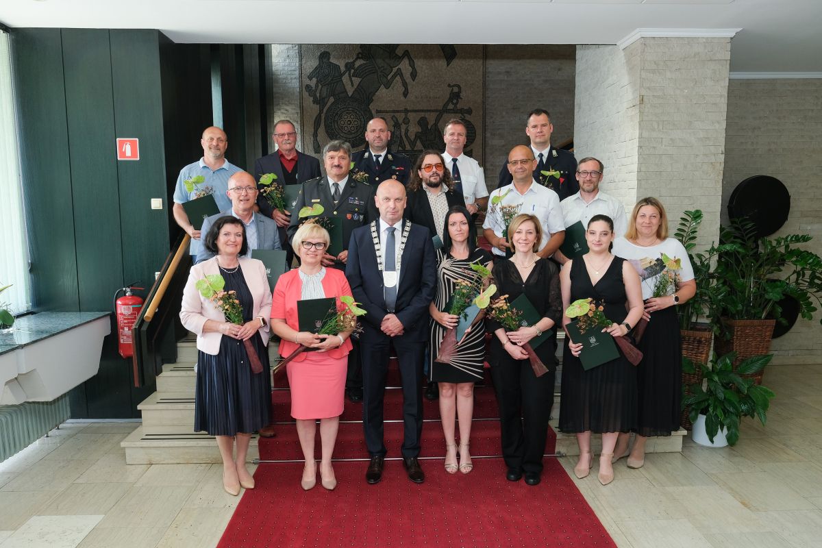 Na včerajšnji slavnostni seji Občinskega sveta Mestne občine Krško v počastitev občinskega praznika je župan Janez Kerin v Kulturnem domu podelil letošnje nagrade in priznanja za ustvarjalno delo, posebne uspehe in pomemben prispevek k razvoju lokalne skupnosti. Veliki znak sta prejela Dušan Vodlan in Društvo Sonček Posavje, znak družba Mlin Katić, d.o.o. in Simfonični orkester Glasbene šole Krško, priznanje pa Sonja levičar, Tanja Uduč, Matjaž Gomilšek in Aleš Suša. Slavnostni govorec dr. Vladimir Prebilič, župan občine Kočevje in predsednik Skupnosti občin Slovenije, je v govoru poudaril pomembnost lokalne samouprave, ki je bistvo demokracije.