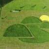 Izhodišče za košnjo je bil znak, natisnjen na format A4, ki ga je Viktor na travniku povečal v razmerju 1:500, z različnimi višinskimi nivoji košnje trave pa je omogočil različne barve znaka.