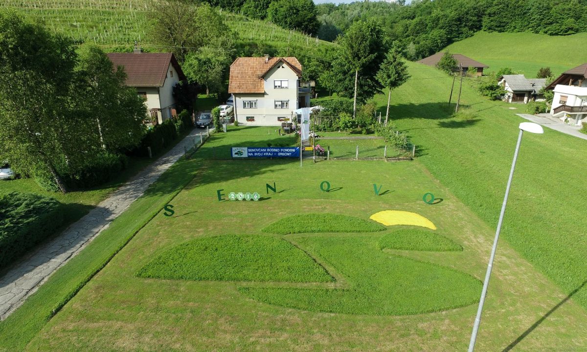 Viktor Richter s Senovega se je letos lotil novega podviga s svojo kosilnico, je sporočil Boštjan Colarič. V prejšnjih letih je na svojem travniku že oblikoval marsikatero zanimivo podobo, tokrat pa se je lotil znaka – logotipa Krajevne skupnosti Senovo. Pred tem je iz trate na dvorišču pred hišo ustvaril znak Republike Slovenije, Občine Krško, letos pa še logotip domačega kraja.