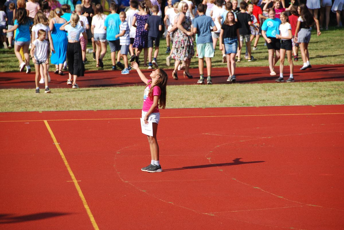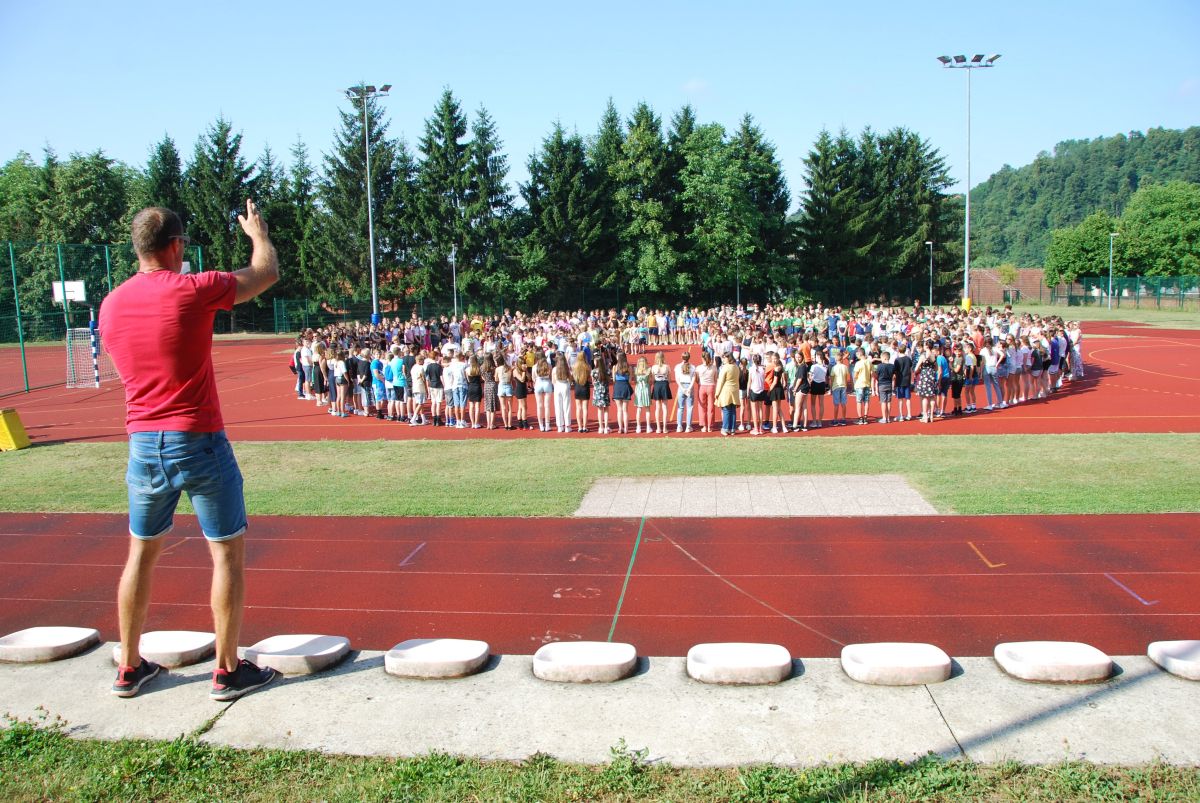Na zadnji šolski dan smo se zopet spomnili našega letošnjega jubilejnega rojstnega dne šole – 50 let – zato smo se v ta namen v jutranjih urah najprej vsi zbrali na šolskem igrišču, kjer smo s postavitvijo narisali 50 let – vse to je posnel tudi dron.