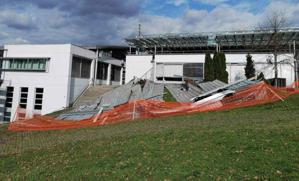 Tudi s strehe še visijo kosi odlomljenih stekel in lesa, vsake toliko časa se še kaj odlomi, sporočajo starši otrok, ki so razočarani in besni, da takšno stanje, ki je menda tudi nevarno, ostaja toliko časa. Saj so se ponujali, da bi pomagali odpeljati navlako in tudi kaj popravili, a ker mora vse potekati po črki zakona, se to ne sme in vse stoji. Slišati je, da so predračuni izvajalcev, ki bi to odpeljali, za občino predragi.