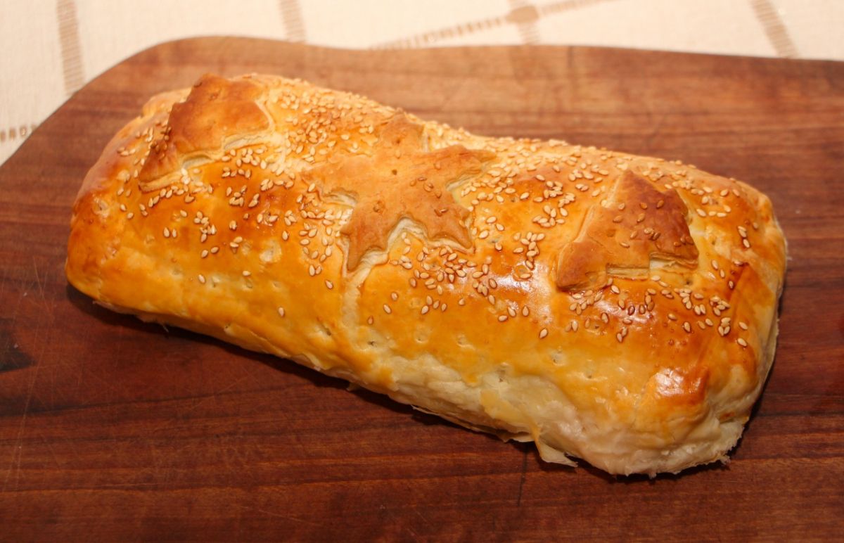 Sestavine (za družino – dva odrasla in dva otroka ali tri odrasle): 400 g svinjske ribice, 100 g mlade špinače, 100 g pršuta, dva zavitka listnatega testa, česen v prahu, sveže zmlet poper, sol, olivno olje, eno raztepeno jajce za premaz, sezam za posip