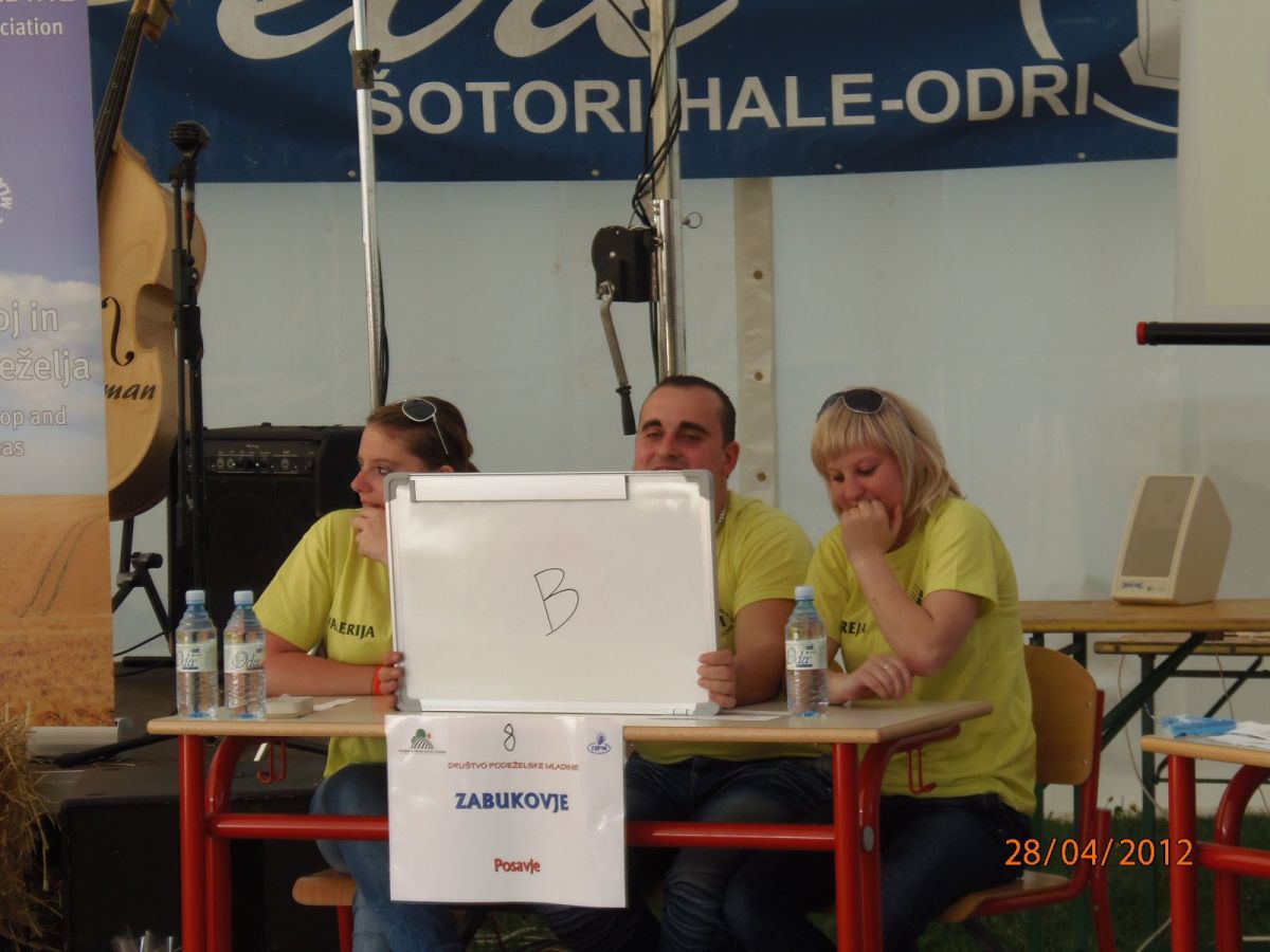 Društvo podeželske mladine Zabukovje se redno udeležuje regijskega kviza Mladi in kmetijstvo, katerega je letos organiziralo DPM Brežice. Bili smo zelo uspešni saj smo si z zmago zagotovili napredovanje na državni kviz, ki je potekal 28. aprila v Žirovnici na Gorenjskem. DPM Zabukovje in s tem tudi posavsko regijo so zastopali Andreja Trupi, Valerija Pečnik in Franci Budna. Letošnje teme so bile konjenikov priročnik, pomen sadja in zelenjave v prehrani in zadružništvo. Kljub močni konkurenci smo zasedli odlično 6. mesto izmed 11 ekip.