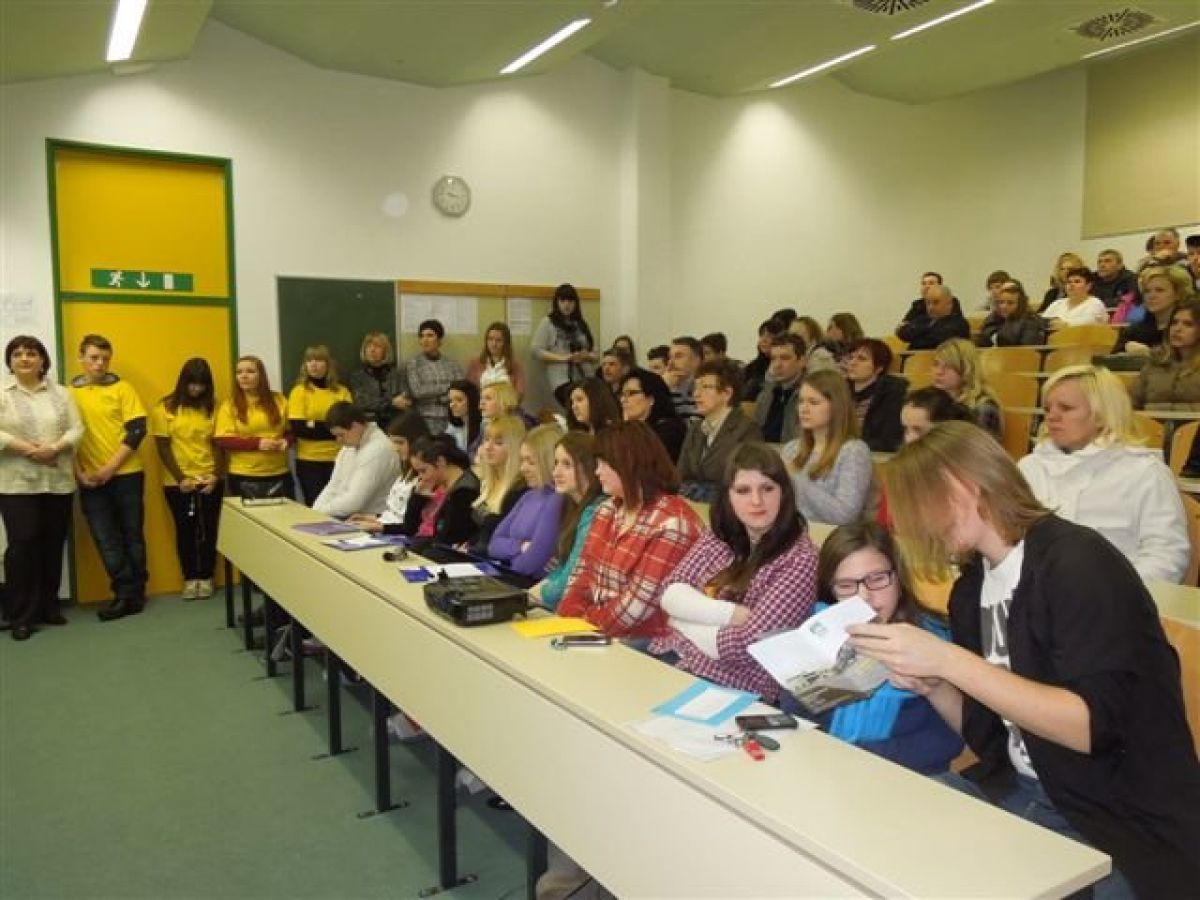 V prvem skupnem delu sprejema sta dijaka Hana Volčanšek in Lukas Tomič v veliki predavalnici najprej pozdravila goste in spregovorila o svojih osebnih izkušnjah s srednješolsko izbiro ter predstavila tudi izredno paleto možnosti za obšolske dejavnosti in potovanja v okviru različnih projektov, saj šola sodeluje skoraj z deseterico šol iz drugih evropskih držav. Povabila sta ravnatelja Martina Šoška, da je predstavil šolo in dobre pogoje dela na njej ter profesorski pristop, ki pod motom »mar nam je za vsakogar« omogoča individualno prilagajanje tistim, ki potrebujejo več pomoči in spodbude, pa tudi vsem tistim, ki zmorejo več na različnih področjih in potrebujejo ustrezno podporo in razumevanje tudi za obveznosti izven šole. V nadaljevanju je Mojca Ogorevc spregovorila o možnostih, ki jih nudimo za posebej nadarjene na šoli, da lahko razvijajo svoje specifične talente in hkrati uspešno dokončajo izobraževanje. Dijaki posameznih programov so s pomočjo šolske publikacije in pod mentorstvom vodij programskih učiteljskih zborov na kratko predstavili vsak svoj program, in sicer ekonomki tehnik, logistični tehnik, trgovec ter PTI (3+2) program za pridobitev naziva ekonomski tehnik. Na enoti Višje strokovne šole, ki deluje v okviru ETrŠ Brežice že 13-to leto, se več kot uspešno izvaja tudi terciarno izobraževanje za pridobitev 6. stopnje izobrazbe - naziv ekonomist. Šola je verificirana tudi za izobraževanje odraslih, ki si lahko na ta način izboljšajo življenjske in zaposlitvene možnosti.