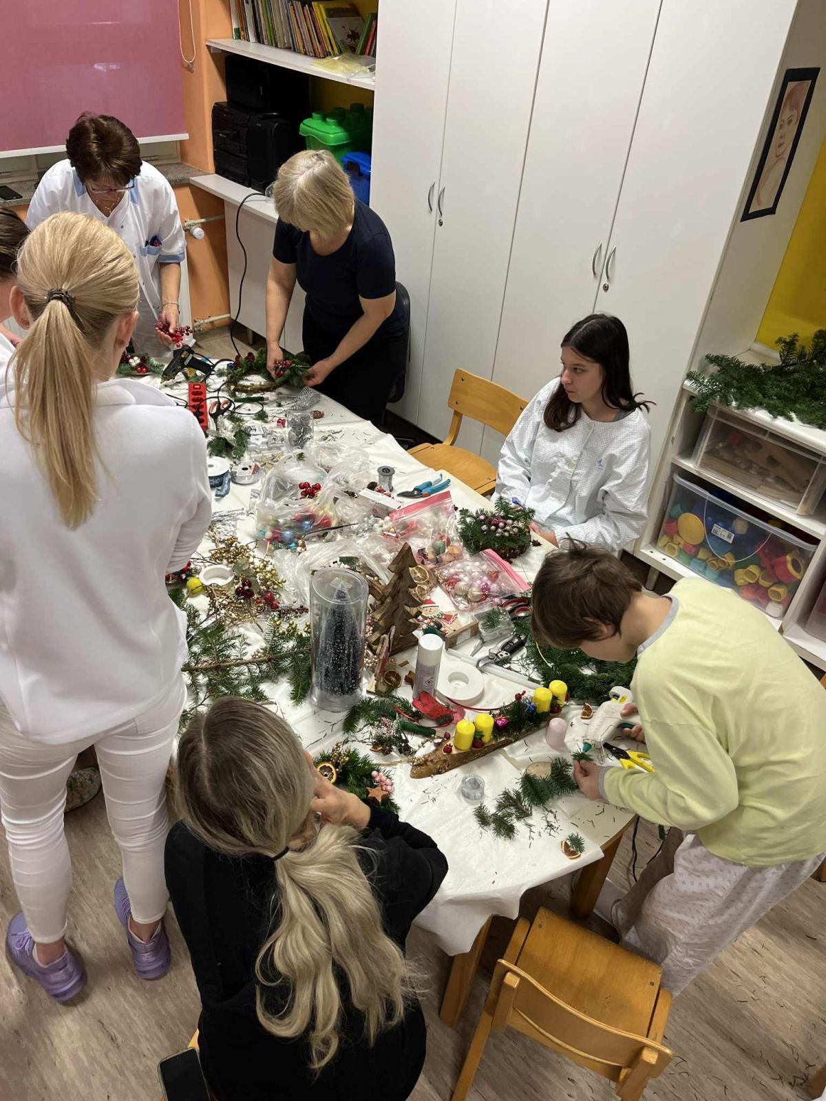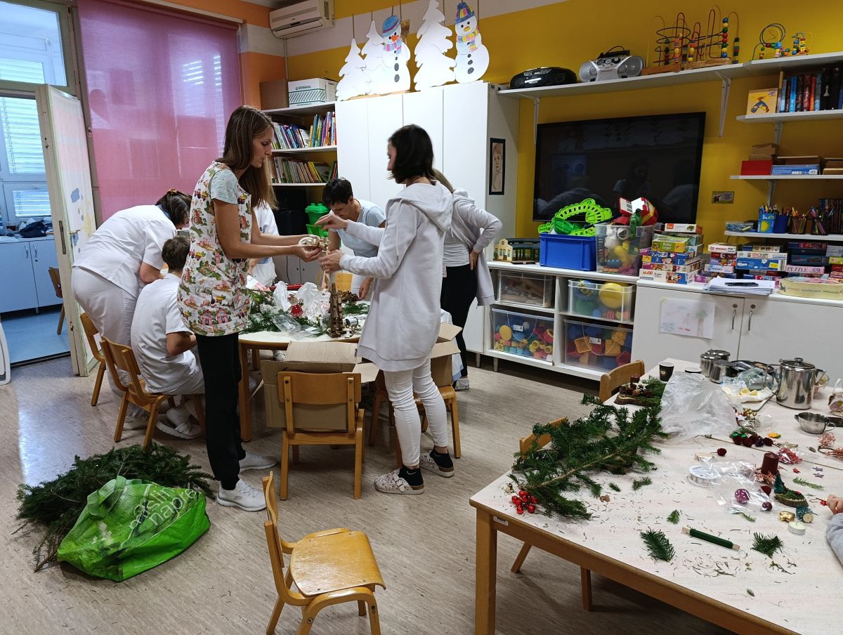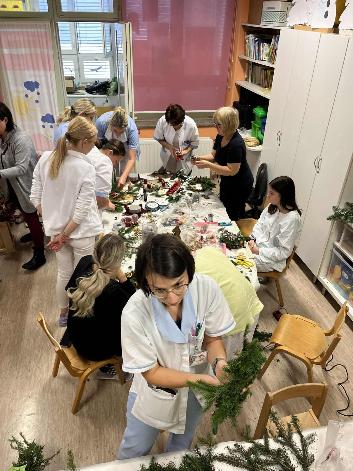 Prostor sta preplavila vonj sveže smreke in ciprese ter veselo ustvarjalno razpoloženje. Ga. Barbara iz GG Novo mesto je pripravila delavnico adventnih aranžmajev, ki je pritegnila male paciente, njihove starše in zaposlene.