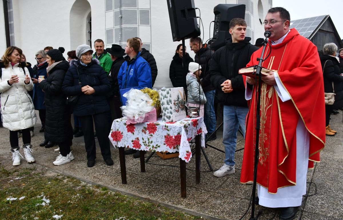 Blagoslovil je cerkev – novo fasado in ostala cerkvena dela, pa tudi dva mašniška plašča, ki jih je darovala gospa. Po maši so se verniki zbrali pred cerkvijo. V dokaj mrzlem dnevu so v povorki prijezdili konjeniki in se nekateri pripeljali z vprego do cerkvice.