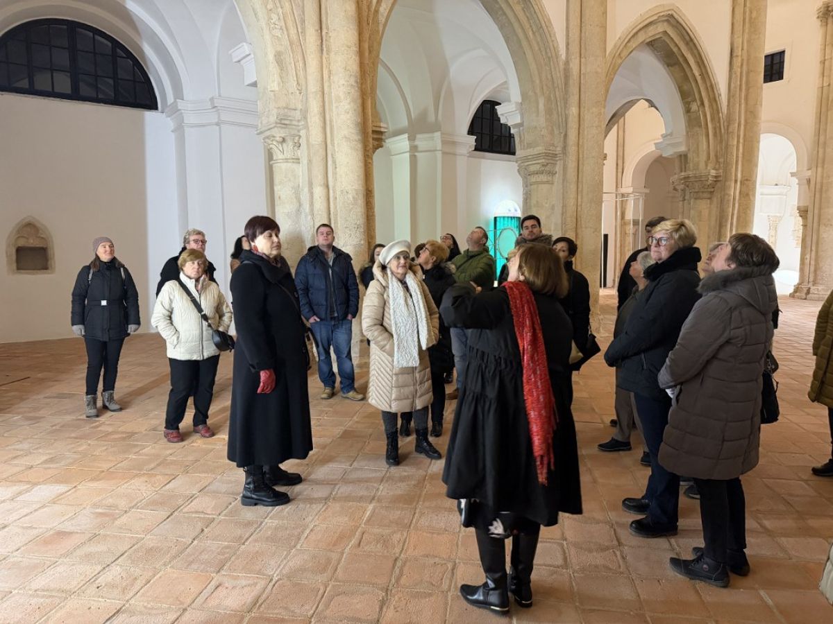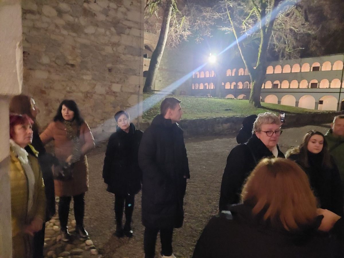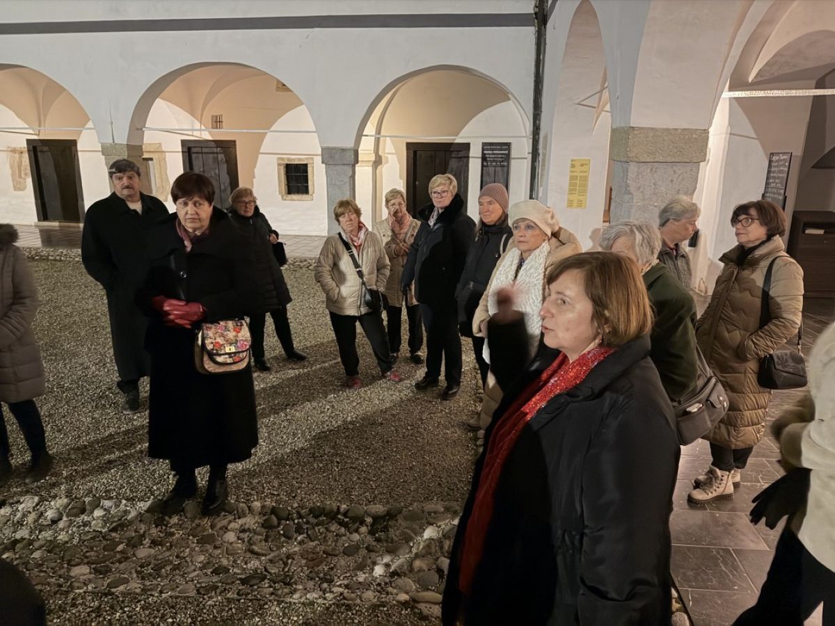 30 članov in članic vseh starosti je na notranjem dvorišču (ki je, mimogrede, največje arkadno dvorišče v Srednji Evropi) nekdanjega cistercijanskega samostana pričakala prijazna kustosinja Sabina Zupan, ki nas je popeljala med zidovi zgradbe, ki nosi na tisoče zgodb iz različnih zgodovinskih obdobij. Samostan Marijin Studenec, v katerem so delovali cistercijani, je leta 1234 ustanovil koroški vojvoda Bernard Spanheimski, in je znan po bivši samostanski cerkvi in najobsežnejših arkadah izmed vseh stavb v Sloveniji, tudi grajskih.