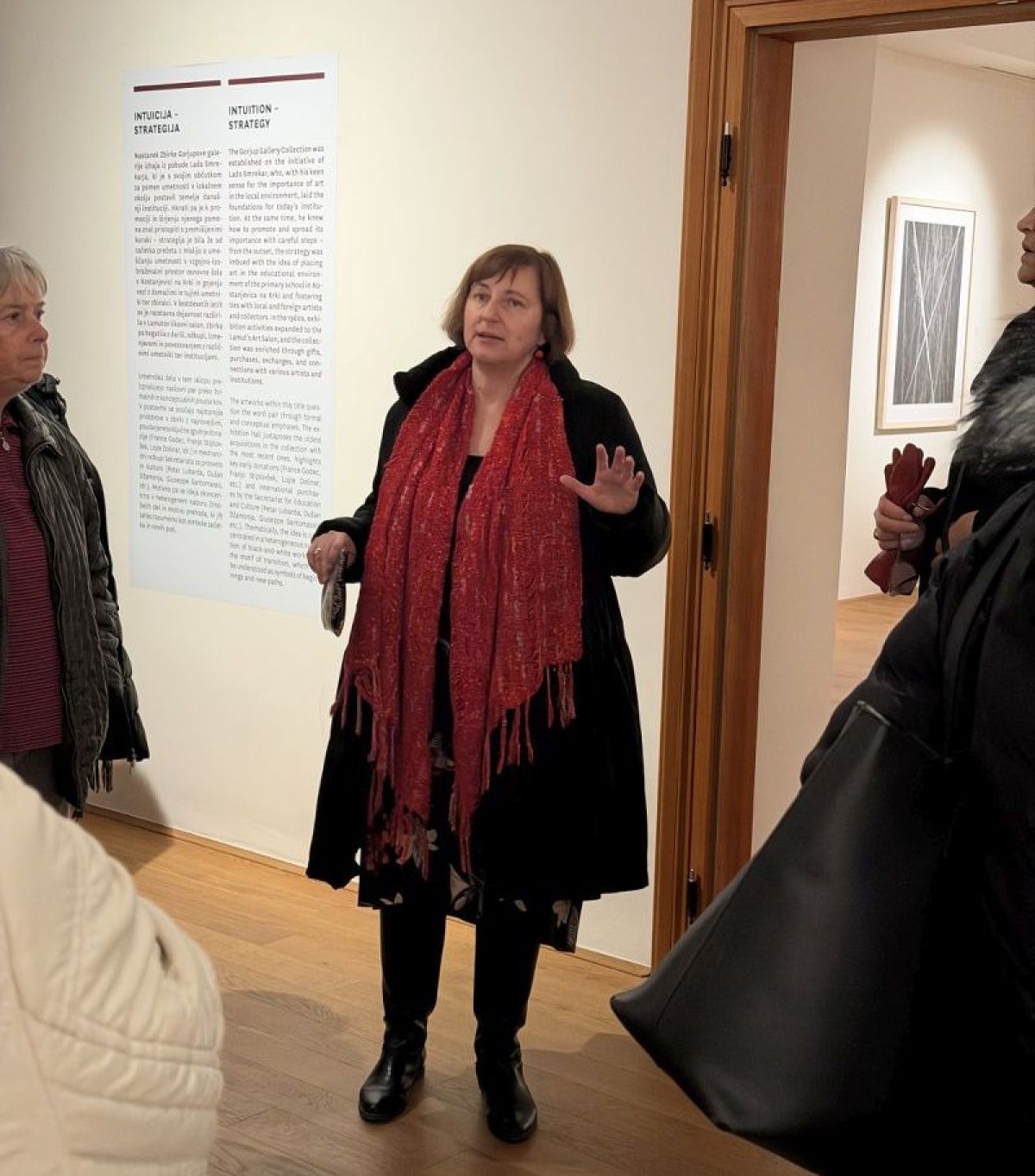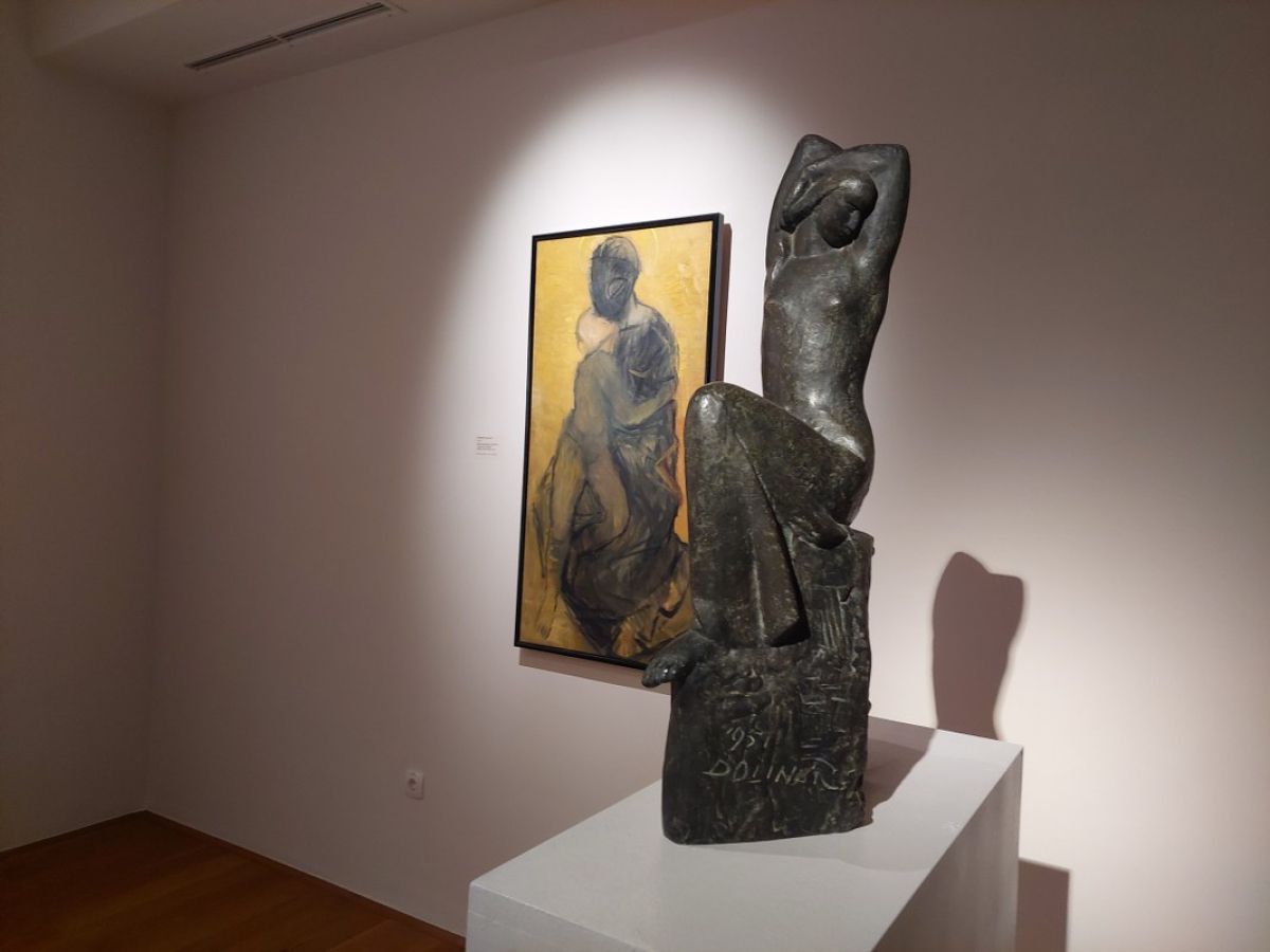 Zatem smo se podali po stopnišču in se prepustili razstavi Smeri razvoja: Dela iz Zbirke Gorjupove galerije, s katero je obeležena 50. obletnico ustanovitve Galerije Božidar Jakac v Kostanjevici na Krki. Kot je povedala kustosinja, je razstavazasnovana na principu besednih parov. Ogledali smo si okoli 130 del 110 umetnikov, časovni razpon razstavljenih del pa obsega več kot 100 let likovne produkcije, od leta 1913 (delo Hinka Smrekarja) do leta 2022 (delo Apolonije Simon). Kot zanimivost: najstarejši še živeči razstavljeni umetnik, Karel Zelenko, je prav na dan otvoritve te razstave v septembru letos napolnil 100 let, najmlajša, Tajda Novšak pa je z 31 leti najmlajša med umetniki, katerih dela so dana na ogled na razstavne površine največjega likovnega muzeja v Sloveniji.