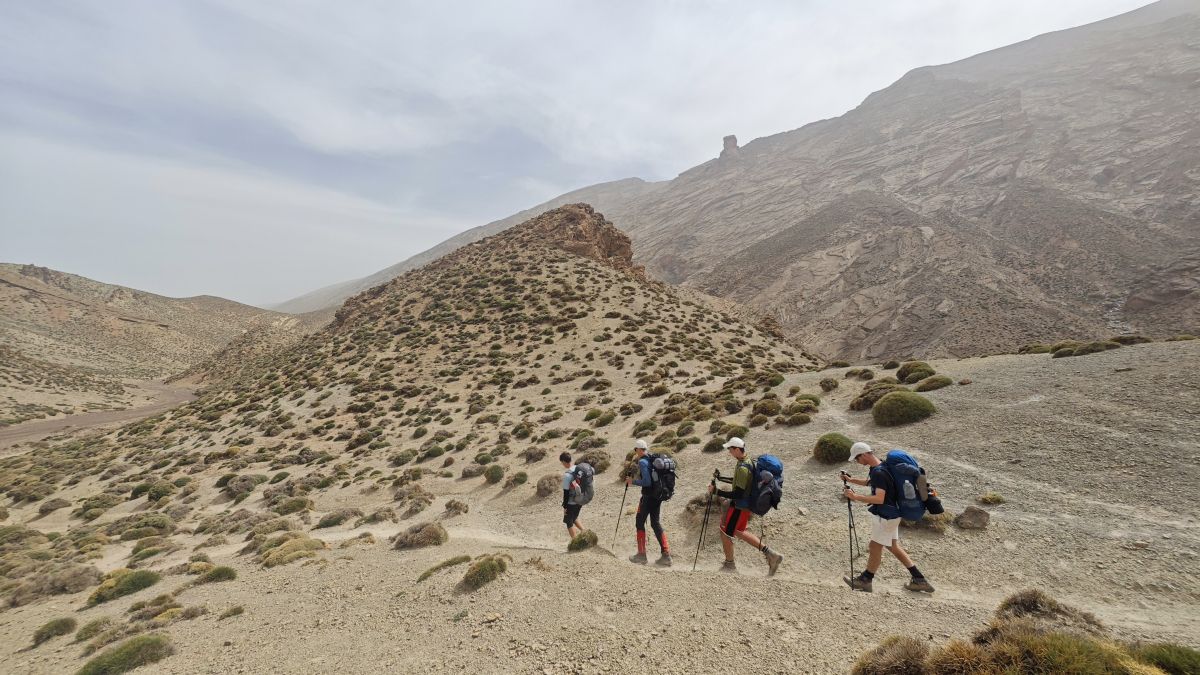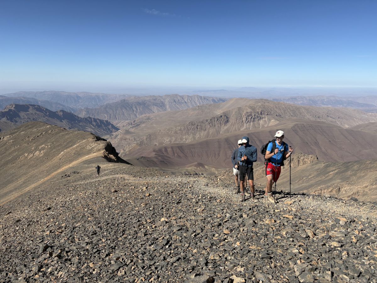 Vzpon na vrh se je drugi dan začel tam, kjer se pot in pogled izgubita v razgledih — na prelazu Tizi n’Oumsoud ( 2.988 m), do katerega smo hodili dobri dve uri. Do sedla ni markacij, ni smernih tabel, zgolj veter, ki prihaja iz puščave, in bolj ali manj jasna linija gor, tista, ki je ne izbereš zaradi udobja, ampak zato, ker te izzove. V Alpah bi jo imenovali strma grebenska pot; tukaj je to samo smer, ki te nemo vabi, ali ji boš kos.
