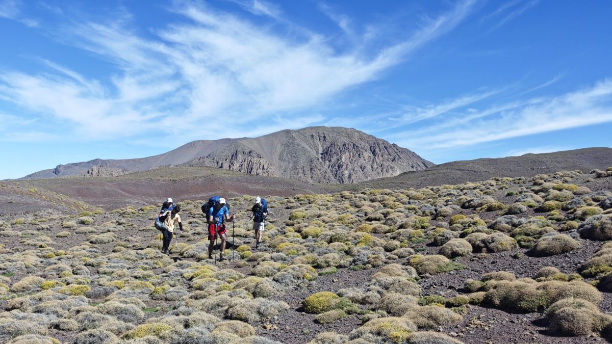 Prvi metri so bili preveč preprosti, skoraj zavajajoči. Kamenje je bilo drobno, a nezanesljivo, kot bi preverjalo korak, medtem ko se je teren naglo dvigal. Hitro smo prišli na grušč, kjer se vsak korak naredi dvakrat: enkrat z nogo, drugič z ravnotežjem. In ko se odpre širok žleb, ki ni speljan kot pot, temveč kot razpoka v gori, postane jasno: tukaj ne gre samo za hojo, tukaj gre za odločitev. Pri približno 3.300 m je veter prevzel ključno vlogo ter zapihal glasneje, a ni bil hladen — bil je suh, kot bi hotel iz nas potegniti besede, ki smo jih čutili v srcih. Zrak je postajal redkejši, premori daljši, vsak meter višine prigaran z odmerjenimi vdihi in izdihi. Na 3.600 m smo dosegli greben, ki pa se ne zadovolji z enim vrhom, ampak vleče naprej kot izziv, ki ponuja razgled samo tistim, ki si zanj vzamejo čas. Greben M’Gouna ni udoben sprehod. Je dolg, izpostavljen, poln drobljivega kamenja in brez varoval, a zato toliko lepši in bolj naraven ter gorniško pristen. Vsak svež piš vetra nam je pomagal odpihniti utrujenost v vse bolj težkih nogah, vsak nov meter pa je zahteval koncentracijo.